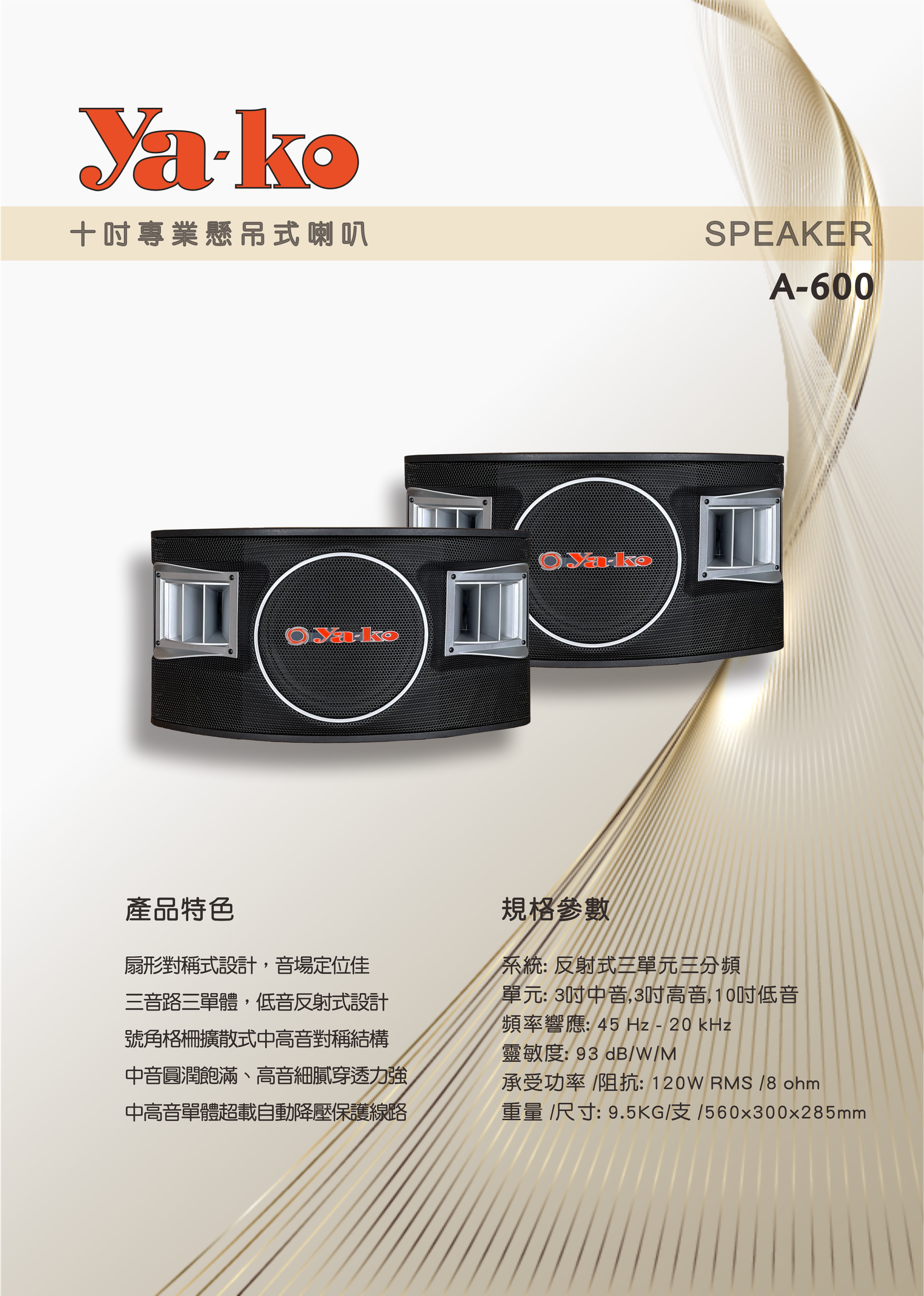 A-600 10”專業懸吊喇叭產品特點技術規格型錄下載產品特點• 扇形對稱式設計,音場定位佳• 三音路三單體,低音反射式設計• 號角格柵擴散式中高音對稱結構• 中音圓潤飽滿、高音細膩穿透力強• 中高音單體超載自動降壓保護線路技術規格頻率響應:45Hz~20KHz靈敏度:93dB/W/M承受功率:120W阻抗:8Ω重量:9.5kg箱體尺寸:56(W)x30(H)x28.5(D) cm型錄下載 型錄下載